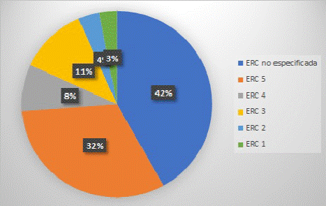 Figura 4: Distribución según clasificación del estadio de la enfermedad renal crónica en pacientes de Ambato, Ecuador, entre 2017 y 2019. ERC: enfermedad renal crónica.